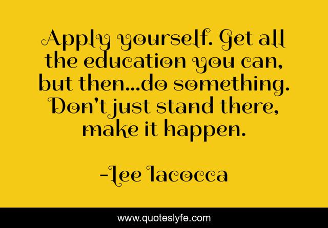 This page presents the quote "Apply yourself. Get all the education you can, but then...do something. Don't just stand there, make it happen.". Author of this quote is Lee Iacocca. This quote is about education, success,.