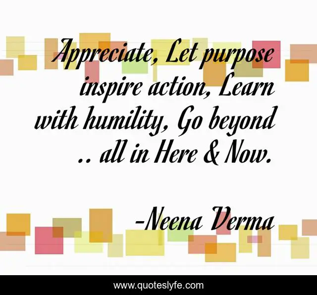 This page presents the quote "Appreciate, Let purpose inspire action, Learn with humility, Go beyond .. all in Here & Now.". Author of this quote is Neena Verma. This quote is about here-now, learn, appreciate, purpose, inspire,.