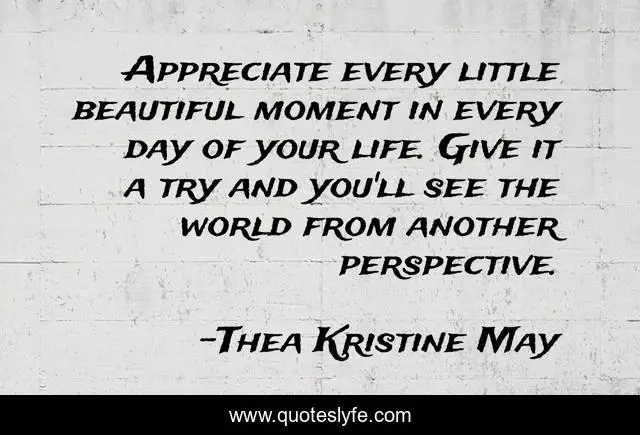 This page presents the quote "Appreciate every little beautiful moment in every day of your life. Give it a try and you'll see the world from another perspective.". Author of this quote is Thea Kristine May. This quote is about life, inspirational, optimism, positive-thinking, optimistic, life-lessons, enthusiasm, life-and-living,.