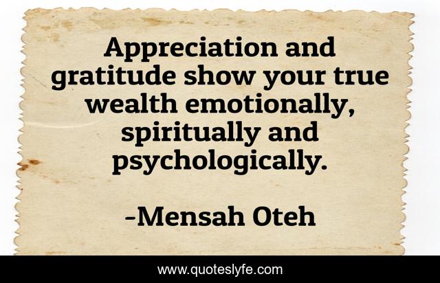 "Mensah Oteh Quotes." Quoteslyfe.com, 2025. Fri. 05 Dec. 2025. <https://www.quoteslyfe.com/quote/Appreciation-and-gratitude-show-your-true-wealth-49249>.