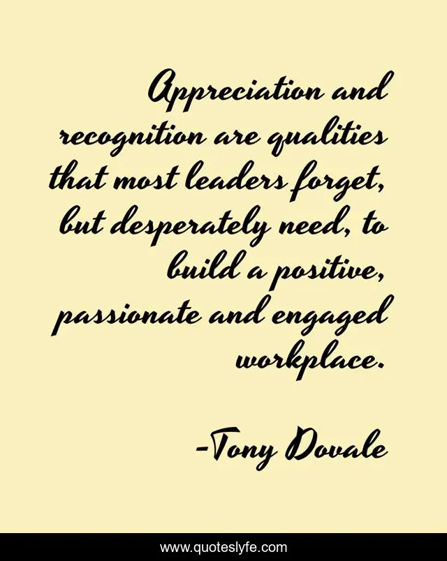 This page presents the quote "Appreciation and recognition are qualities that most leaders forget, but desperately need, to build a positive, passionate and engaged workplace.". Author of this quote is Tony Dovale. This quote is about courageous-mindsets, swift-success, creativity, tony-dovale, leadership, innovation, lifemasters, revolutionary-workplace, staff-engagement,.