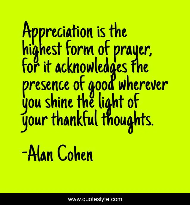This page presents the quote "Appreciation is the highest form of prayer, for it acknowledges the presence of good wherever you shine the light of your thankful thoughts.". Author of this quote is Alan Cohen. This quote is about shine, appreciation, light, presence, thankful, prayer, thoughts,.