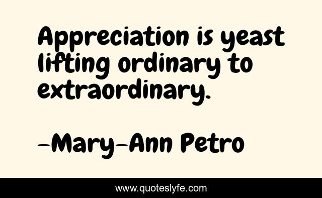 "Mary-Ann Petro Quotes." Quoteslyfe.com, 2025. Fri. 05 Dec. 2025. <https://www.quoteslyfe.com/quote/Appreciation-is-yeast-lifting-ordinary-to-extraordinary-265432>.