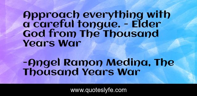 This page presents the quote "Approach everything with a careful tongue. - Elder God from The Thousand Years War". Author of this quote is Angel Ramon Medina, The Thousand Years War. This quote is about action-adventure, science-fiction, fantasy,.