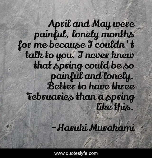 This page presents the quote "April and May were painful, lonely months for me because I couldn't talk to you. I never knew that spring could be so painful and lonely. Better to have three Februaries than a spring like this.". Author of this quote is Haruki Murakami. This quote is about sadness, love, affection,.