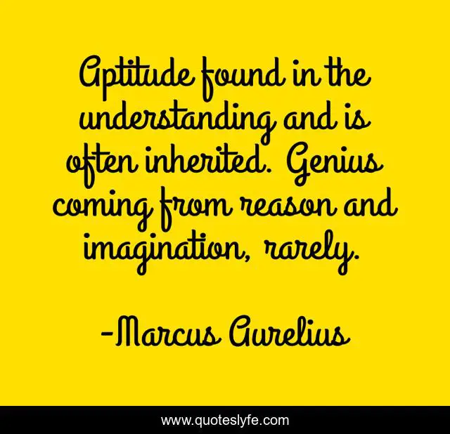 This page presents the quote "Aptitude found in the understanding and is often inherited. Genius coming from reason and imagination, rarely.". Author of this quote is Marcus Aurelius. This quote is about genius, understanding,.