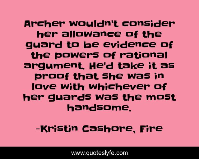 This page presents the quote "Archer wouldn't consider her allowance of the guard to be evidence of the powers of rational argument. He'd take it as proof that she was in love with whichever of her guards was the most handsome.". Author of this quote is Kristin Cashore, Fire. .