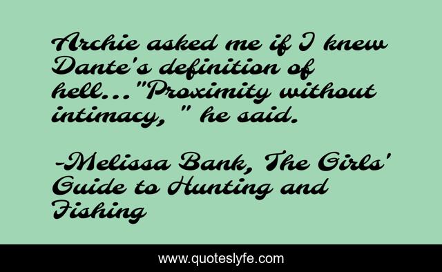 This page presents the quote "Archie asked me if I knew Dante's definition of hell..."Proximity without intimacy, " he said.". Author of this quote is Melissa Bank, The Girls' Guide to Hunting and Fishing. This quote is about relationships, hell, intimacy, dante,.