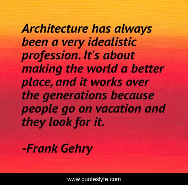This page presents the quote "Architecture has always been a very idealistic profession. It's about making the world a better place, and it works over the generations because people go on vacation and they look for it.". Author of this quote is Frank Gehry. This quote is about world, vacation, people,.