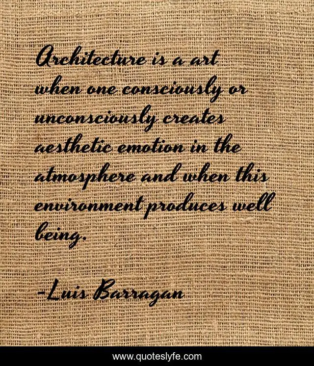 This page presents the quote "Architecture is a art when one consciously or unconsciously creates aesthetic emotion in the atmosphere and when this environment produces well being.". Author of this quote is Luis Barragan. This quote is about environment, emotion, art,.