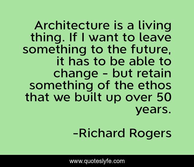 This page presents the quote "Architecture is a living thing. If I want to leave something to the future, it has to be able to change - but retain something of the ethos that we built up over 50 years.". Author of this quote is Richard Rogers. This quote is about future, change,.