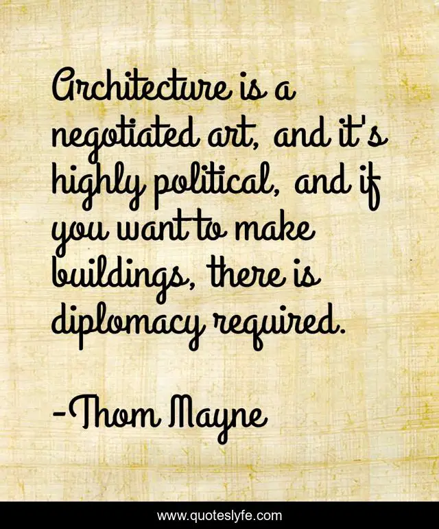 This page presents the quote "Architecture is a negotiated art, and it's highly political, and if you want to make buildings, there is diplomacy required.". Author of this quote is Thom Mayne. This quote is about art, political,.