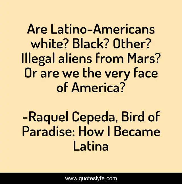 "Raquel Cepeda, Bird of Paradise: How I Became Latina Quotes." Quoteslyfe.com, 2025. Mon. 08 Dec. 2025. <https://www.quoteslyfe.com/quote/Are-Latino-Americans-white-Black-Other-Illegal-171498>.