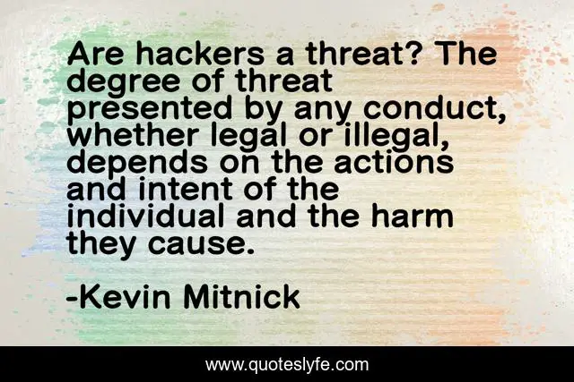 This page presents the quote "Are hackers a threat? The degree of threat presented by any conduct, whether legal or illegal, depends on the actions and intent of the individual and the harm they cause.". Author of this quote is Kevin Mitnick. This quote is about individual, intent, actions,.