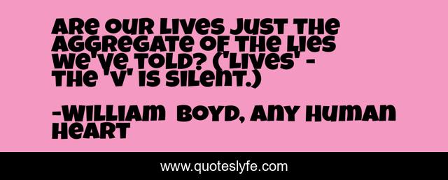 This page presents the quote "Are our lives just the aggregate of the lies we've told? ('Lives' - the 'v' is silent.)". Author of this quote is William Boyd, Any Human Heart. This quote is about lies, lying,.