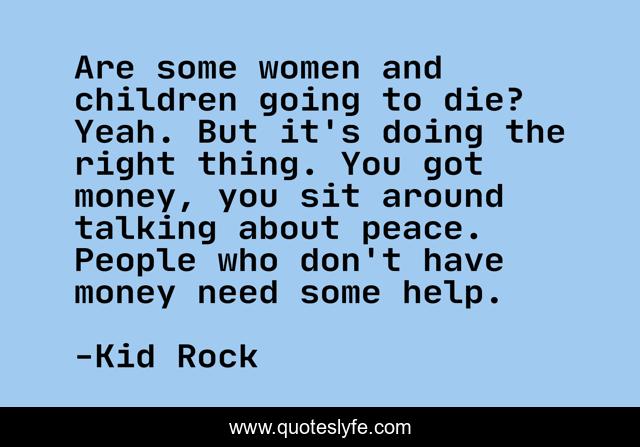 This page presents the quote "Are some women and children going to die? Yeah. But it's doing the right thing. You got money, you sit around talking about peace. People who don't have money need some help.". Author of this quote is Kid Rock. This quote is about money, peace, children,.