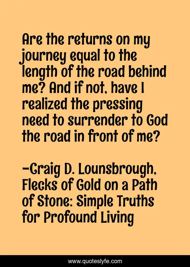 This page presents the quote "Are the returns on my journey equal to the length of the road behind me? And if not, have I realized the pressing need to surrender to God the road in front of me?". Author of this quote is Craig D. Lounsbrough, Flecks of Gold on a Path of Stone: Simple Truths for Profound Living. This quote is about returns, ahead, god, sufficient, pay-off, front, behind, journey, need,.