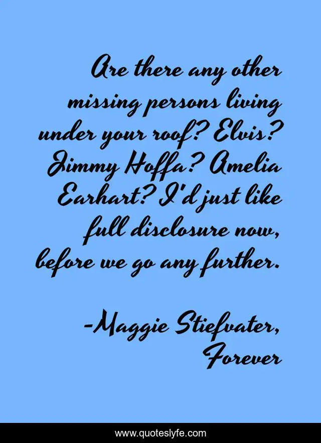 This page presents the quote "Are there any other missing persons living under your roof? Elvis? Jimmy Hoffa? Amelia Earhart? I'd just like full disclosure now, before we go any further.". Author of this quote is Maggie Stiefvater, Forever. This quote is about funny, shiver, comedy, officer-koenig,.