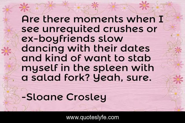 This page presents the quote "Are there moments when I see unrequited crushes or ex-boyfriends slow dancing with their dates and kind of want to stab myself in the spleen with a salad fork? Yeah, sure.". Author of this quote is Sloane Crosley. This quote is about moments, myself,.