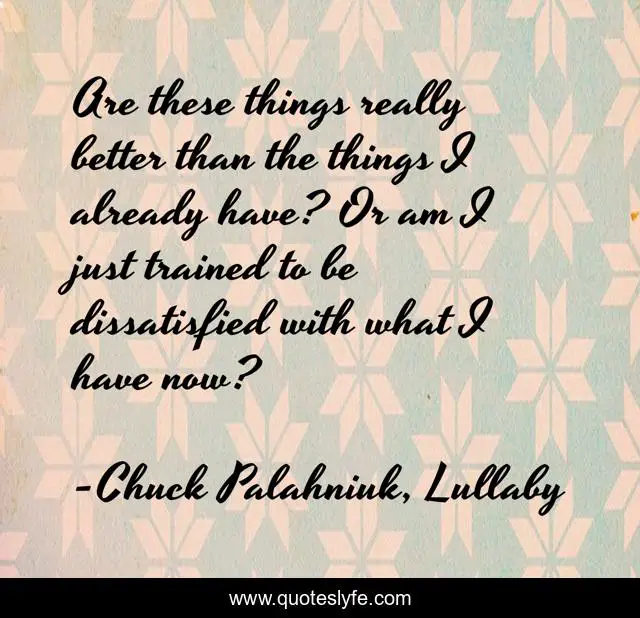 This page presents the quote "Are these things really better than the things I already have? Or am I just trained to be dissatisfied with what I have now?". Author of this quote is Chuck Palahniuk, Lullaby. This quote is about consumerism, angst, lullaby, dissatisfaction, palahniuk, more,.