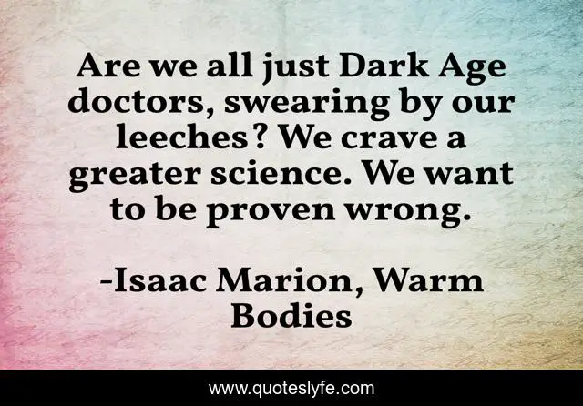 This page presents the quote "Are we all just Dark Age doctors, swearing by our leeches? We crave a greater science. We want to be proven wrong.". Author of this quote is Isaac Marion, Warm Bodies. .