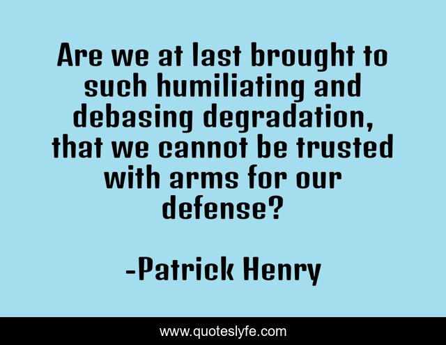 This page presents the quote "Are we at last brought to such humiliating and debasing degradation, that we cannot be trusted with arms for our defense?". Author of this quote is Patrick Henry. This quote is about defense, last, trusted,.