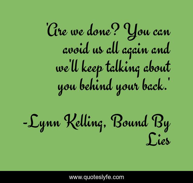 This page presents the quote "'Are we done? You can avoid us all again and we'll keep talking about you behind your back.'". Author of this quote is Lynn Kelling, Bound By Lies. .