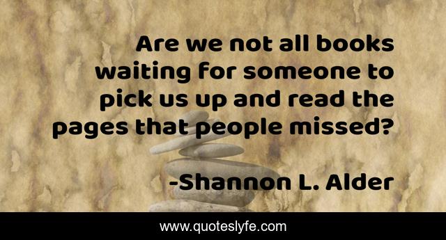 This page presents the quote "Are we not all books waiting for someone to pick us up and read the pages that people missed?". Author of this quote is Shannon L. Alder. This quote is about tsloama, love, books, happiness, expressing-emotions, trials, overcoming, writers, expressing,.