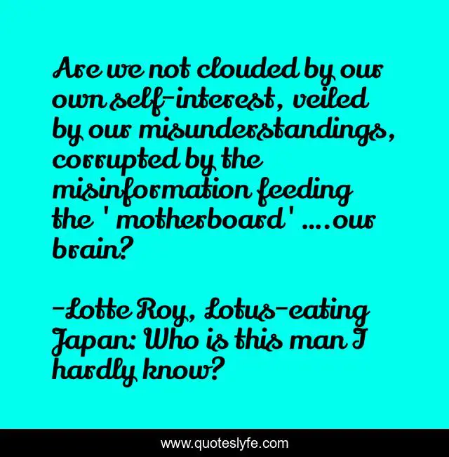 This page presents the quote "Are we not clouded by our own self-interest, veiled by our misunderstandings, corrupted by the misinformation feeding the 'motherboard'….our brain?". Author of this quote is Lotte Roy, Lotus-eating Japan: Who is this man I hardly know?. This quote is about japan, romance-scams, women,.
