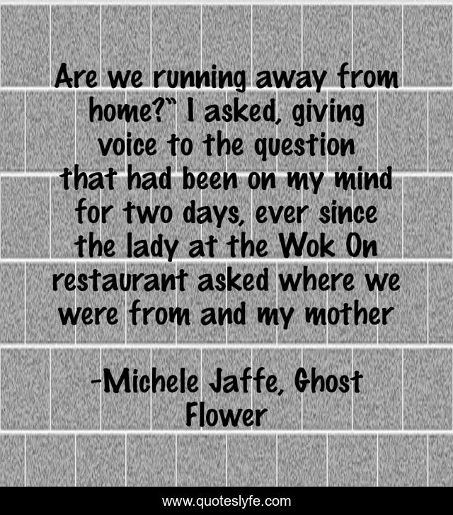 This page presents the quote "Are we running away from home?” I asked, giving voice to the question that had been on my mind for two days, ever since the lady at the Wok On restaurant asked where we were from and my mother". Author of this quote is Michele Jaffe, Ghost Flower. This quote is about running-away, home,.
