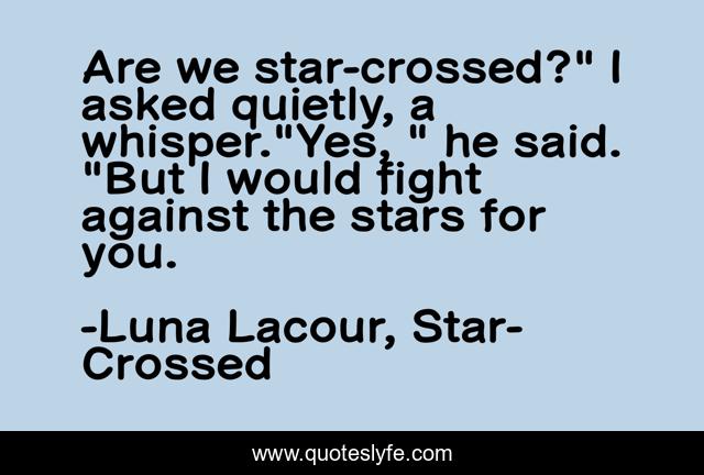 This page presents the quote "Are we star-crossed?" I asked quietly, a whisper."Yes, " he said. "But I would fight against the stars for you.". Author of this quote is Luna Lacour, Star-Crossed. This quote is about romance, forbidden-love, love, romantic, affection,.