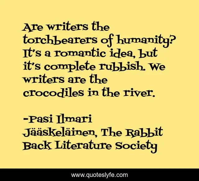 This page presents the quote "Are writers the torchbearers of humanity? It’s a romantic idea, but it’s complete rubbish. We writers are the crocodiles in the river.". Author of this quote is Pasi Ilmari Jääskeläinen, The Rabbit Back Literature Society. .