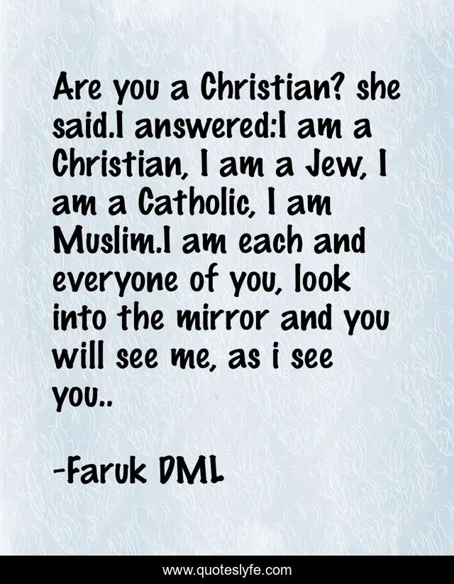 This page presents the quote "Are you a Christian? she said.I answered:I am a Christian, I am a Jew, I am a Catholic, I am Muslim.I am each and everyone of you, look into the mirror and you will see me, as i see you..". Author of this quote is Faruk DML. .