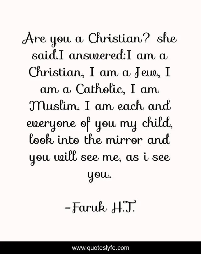 This page presents the quote "Are you a Christian? she said.I answered:I am a Christian, I am a Jew, I am a Catholic, I am Muslim. I am each and everyone of you my child, look into the mirror and you will see me, as i see you..". Author of this quote is Faruk H.T.. .