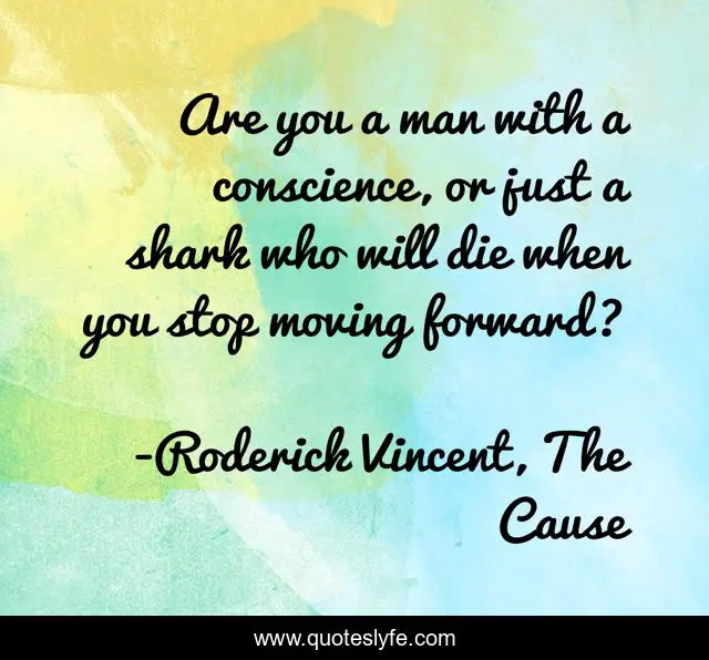 This page presents the quote "Are you a man with a conscience, or just a shark who will die when you stop moving forward?". Author of this quote is Roderick Vincent, The Cause. This quote is about conscience, sharks, shark, moral-courage, morality,.