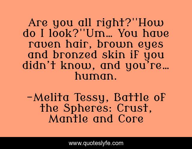 This page presents the quote "Are you all right?''How do I look?''Um… You have raven hair, brown eyes and bronzed skin if you didn’t know, and you’re… human.". Author of this quote is Melita Tessy, Battle of the Spheres: Crust, Mantle and Core. This quote is about brown, humor, wit, looks, human, bronze, raven,.