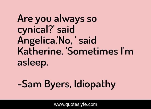This page presents the quote "Are you always so cynical?' said Angelica.'No, ' said Katherine. 'Sometimes I'm asleep.". Author of this quote is Sam Byers, Idiopathy. This quote is about humor, sleep, cynical,.