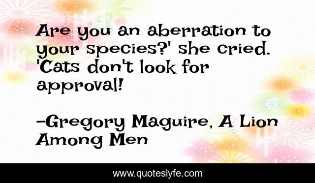 This page presents the quote "Are you an aberration to your species?' she cried. 'Cats don't look for approval!". Author of this quote is Gregory Maguire, A Lion Among Men. This quote is about approval, cats,.
