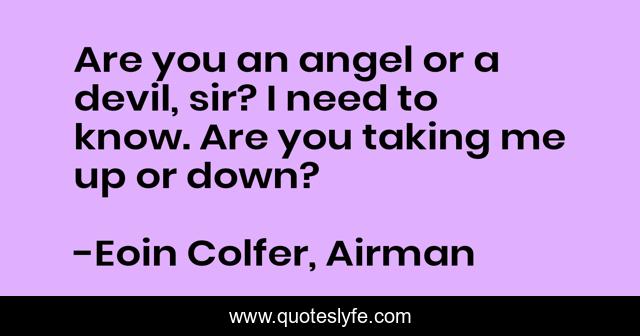 This page presents the quote "Are you an angel or a devil, sir? I need to know. Are you taking me up or down?". Author of this quote is Eoin Colfer, Airman. This quote is about devil, angel, up, down, heaven, hell,.