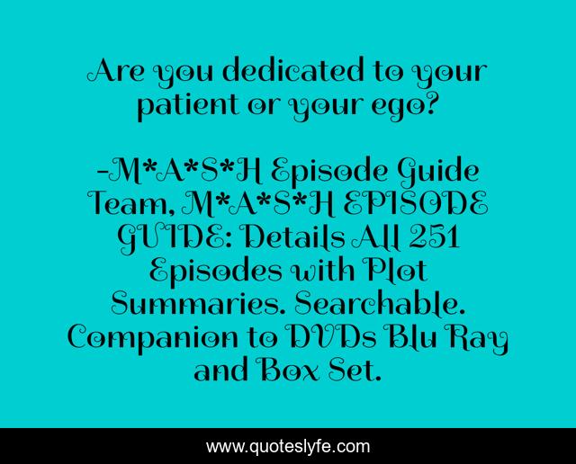 This page presents the quote "Are you dedicated to your patient or your ego?". Author of this quote is M*A*S*H Episode Guide Team, M*A*S*H EPISODE GUIDE: Details All 251 Episodes with Plot Summaries. Searchable. Companion to DVDs Blu Ray and Box Set.. This quote is about discipleship, humility, ministry,.