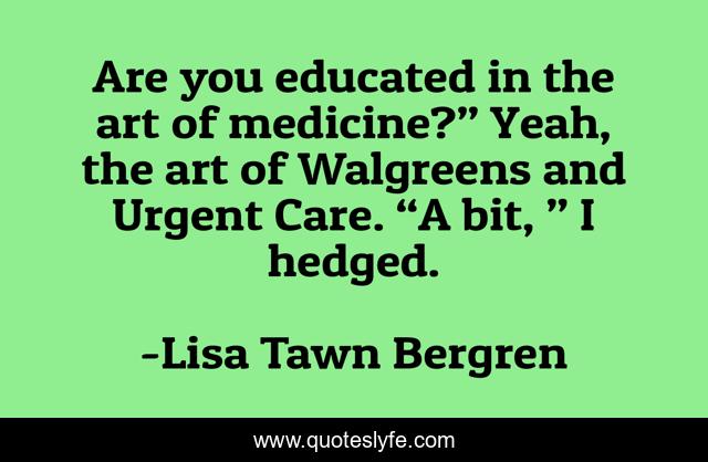 This page presents the quote "Are you educated in the art of medicine?” Yeah, the art of Walgreens and Urgent Care. “A bit, ” I hedged.". Author of this quote is Lisa Tawn Bergren. This quote is about funny, medieval, historcal, fantasy, comedy, care,.