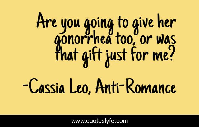 This page presents the quote "Are you going to give her gonorrhea too, or was that gift just for me?". Author of this quote is Cassia Leo, Anti-Romance. This quote is about new-adult, humor, anti-romance, romance, cassi-leo, comedy,.