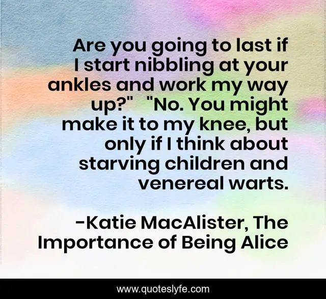 This page presents the quote "Are you going to last if I start nibbling at your ankles and work my way up?" "No. You might make it to my knee, but only if I think about starving children and venereal warts.". Author of this quote is Katie MacAlister, The Importance of Being Alice. .