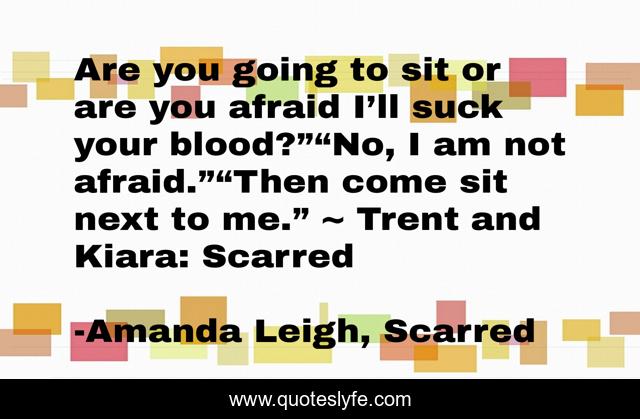 This page presents the quote "Are you going to sit or are you afraid I’ll suck your blood?”“No, I am not afraid.”“Then come sit next to me.” ~ Trent and Kiara: Scarred". Author of this quote is Amanda Leigh, Scarred. This quote is about vampires, ya, na, pnr, vampires-paranormal-romance, witches,.
