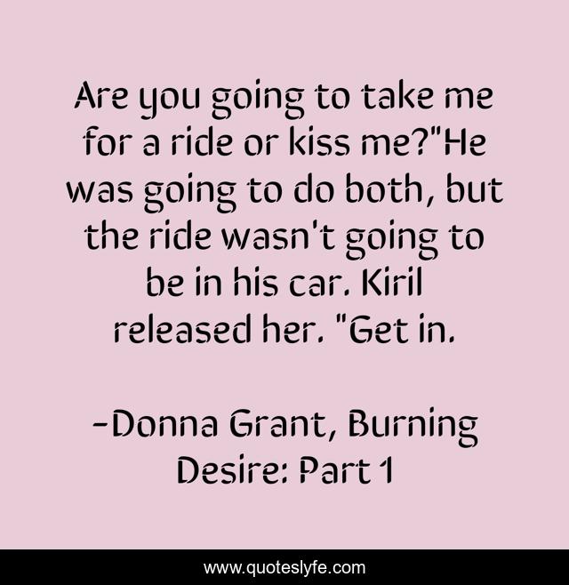 This page presents the quote "Are you going to take me for a ride or kiss me?"He was going to do both, but the ride wasn't going to be in his car. Kiril released her. "Get in.". Author of this quote is Donna Grant, Burning Desire: Part 1. This quote is about paranormal-romance, dragons,.