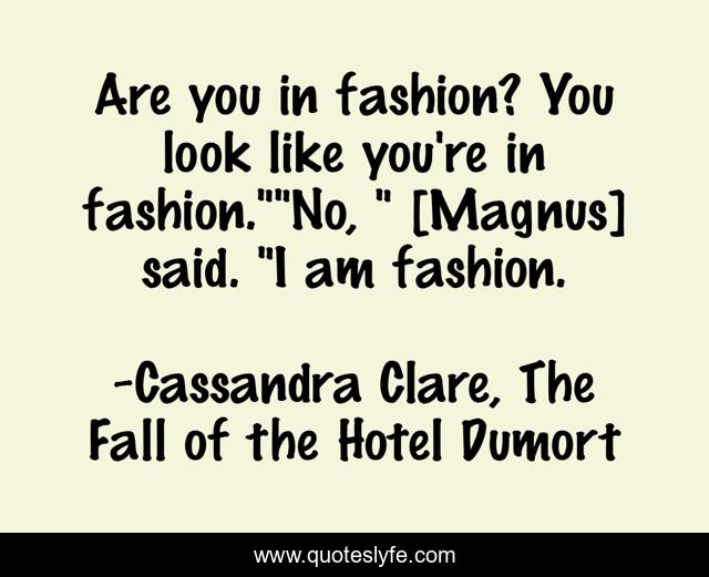 This page presents the quote "Are you in fashion? You look like you're in fashion.""No, " [Magnus] said. "I am fashion.". Author of this quote is Cassandra Clare, The Fall of the Hotel Dumort. This quote is about magnus-bane, fashion,.