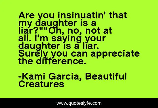 This page presents the quote "Are you insinuatin' that my daughter is a liar?""Oh, no, not at all. I'm saying your daughter is a liar. Surely you can appreciate the difference.". Author of this quote is Kami Garcia, Beautiful Creatures. This quote is about sarcasm, humor, macon,.
