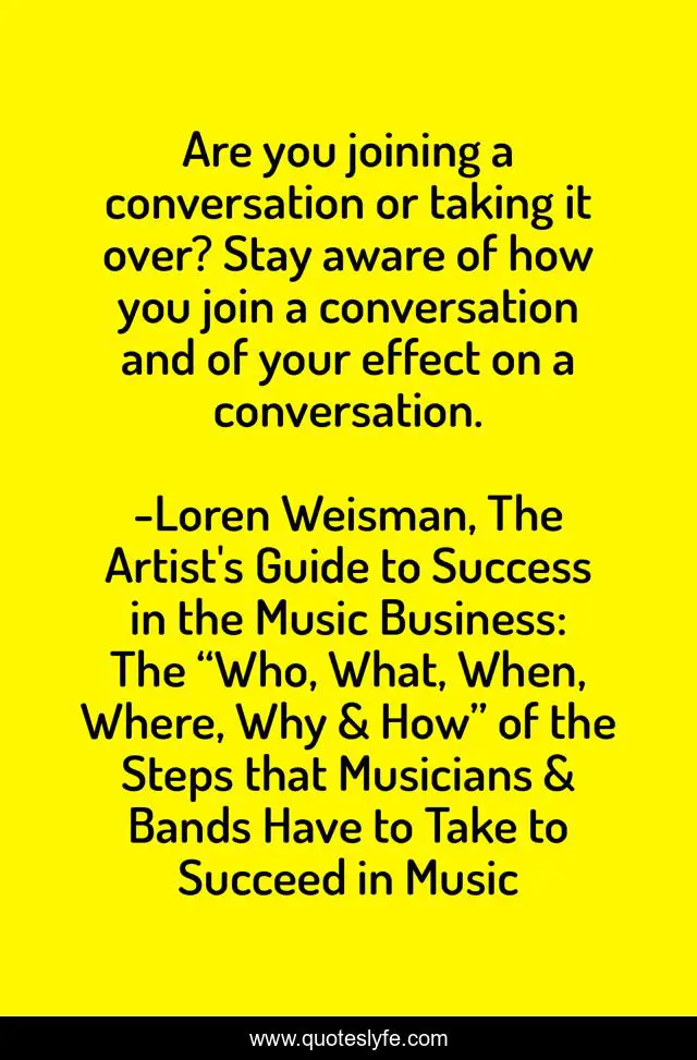 "Loren Weisman, The Artist's Guide to Success in the Music Business: The “Who, What, When, Where, Why & How” of the Steps that Musicians & Bands Have to Take to Succeed in Music Quotes." Quoteslyfe.com, 2025. Fri. 05 Dec. 2025. <https://www.quoteslyfe.com/quote/Are-you-joining-a-conversation-or-taking-28916>.