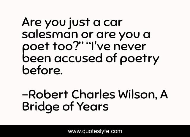 This page presents the quote "Are you just a car salesman or are you a poet too?” “I've never been accused of poetry before.". Author of this quote is Robert Charles Wilson, A Bridge of Years. This quote is about poet, car-salesman, humor, poetry, science-fiction,.