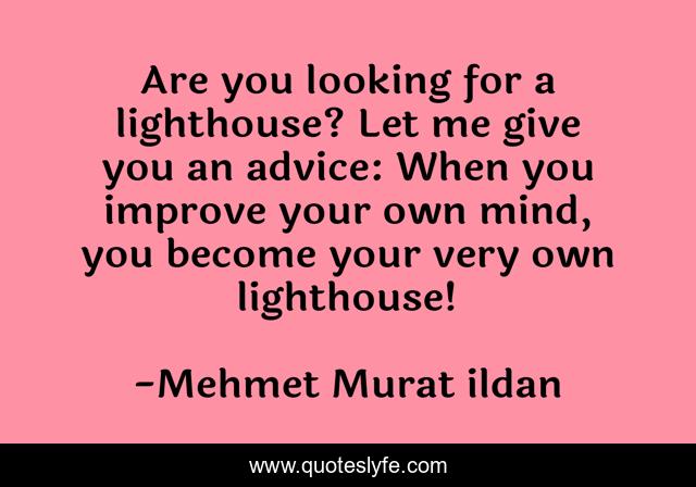 This page presents the quote "Are you looking for a lighthouse? Let me give you an advice: When you improve your own mind, you become your very own lighthouse!". Author of this quote is Mehmet Murat ildan. This quote is about turkish-aphorisms, lighthouse, mehmet-murat-ildan, ildan-wise-sayings, turkish, ildan-wisdom, mind, advice, turkish-playwrights,.